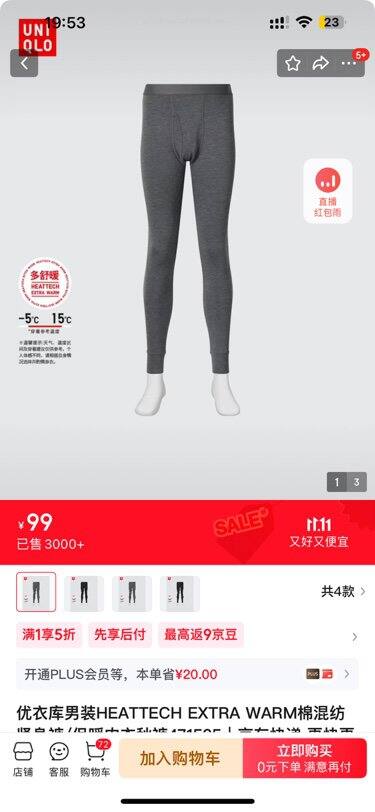 【京东】https://u.jd.com/p1LVOKb CZ154 「优衣库男装HEATTECH EXTRA WARM棉混纺紧身裤/保暖内衣秋裤471525 471525/08深灰色 L」