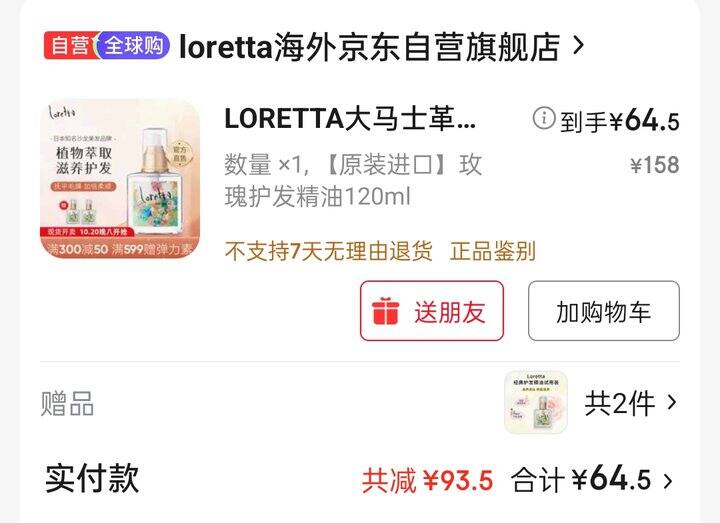 4.Loretta玫瑰护发精油120ml+赠品4ml——64.5元-返利10.69元=53.81元(虽然精油有囤货,看着好价还是忍不住买了)