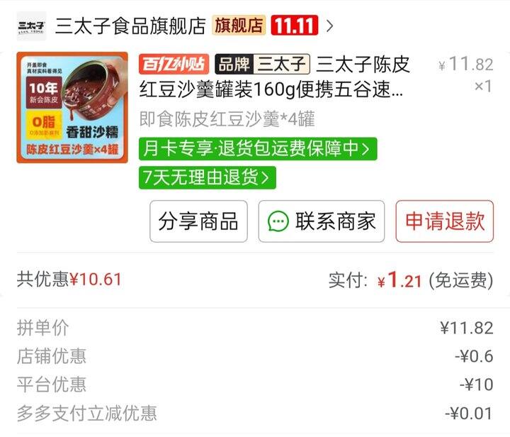 6.三太子陈皮红豆沙羹160g*4罐——1.21元(前20推荐的)