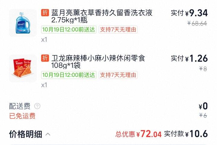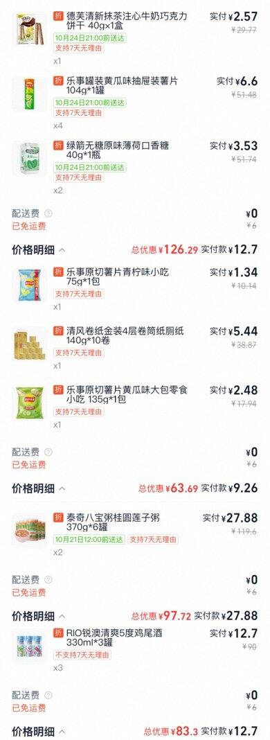 这几天沉迷在闪购买天猫超市半日达的零食、洗衣液上,截了一部分图发上来,只买免运费或者凑满免运费的就很划算。