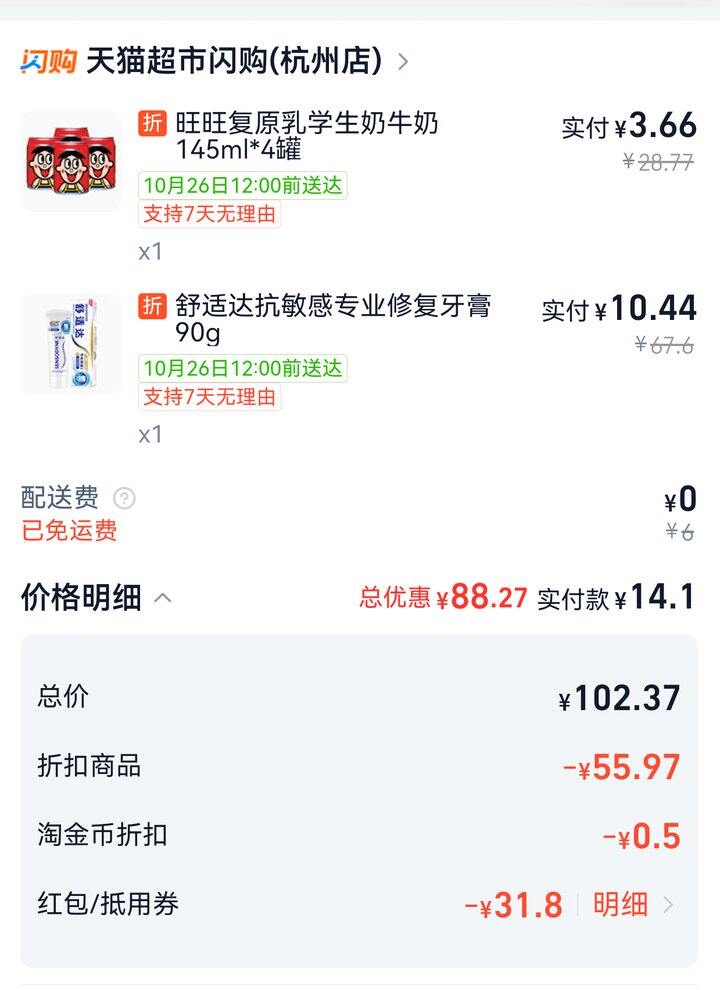 第一单13块钱的舒适达专修牙膏,用评价的3红包和88vip送的26-13红包。