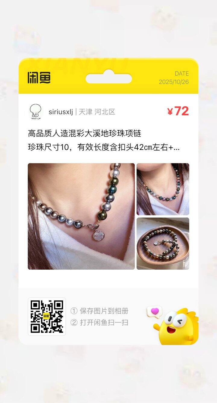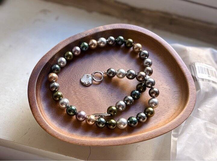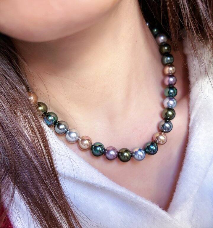 昨天那条人造金珠已出,再挂一条混彩大溪地,也是人造珍珠,但是真的做出来了大溪地珍珠那种油润的珠光。