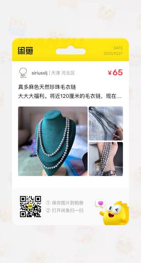 大大大福利。将近120厘米的毛衣链,现在正是戴的时候。没有扣头,直接套头戴。这个价格肯定是有瑕疵的,这条是早几年还不太懂珍珠的时候买的,买来不便宜,珍珠有各种瑕疵,螺纹花皮白斑等等,自己闲鱼上看视频,但毛衣链本来就是配饰,我又给的这个价格。这条还每颗珍珠之间打了结,很讲究的做工,只是品质一般。