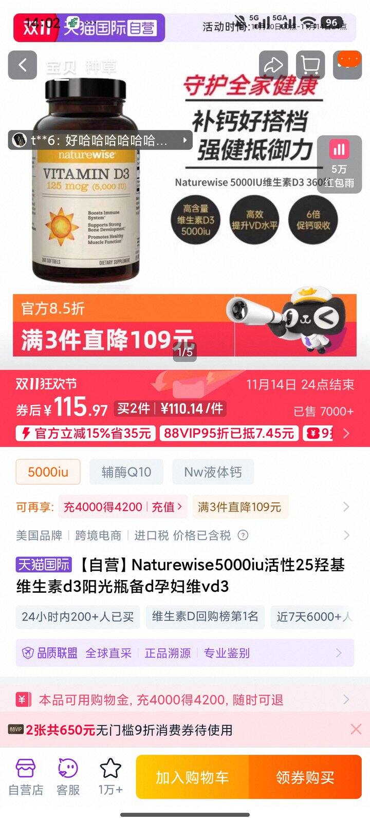 1、Naturewise5000iu活性25羟基维生素d3阳光瓶备d孕妇维vd3 360粒: