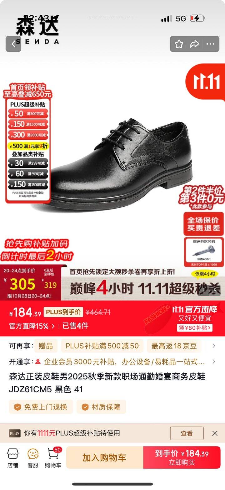 小号刚刚也开了plus,再买一单森达,男款皮鞋也很划算,给家属安排一双,折合到手一双98,还送三双男袜,买同样的真的很划算,有拼的私信评论联系我哈~