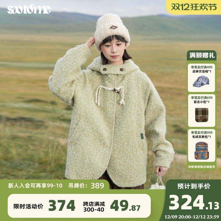 【夹棉】早乙女惠子saotome 日系复古毛呢肌理牛角扣短款连帽大衣