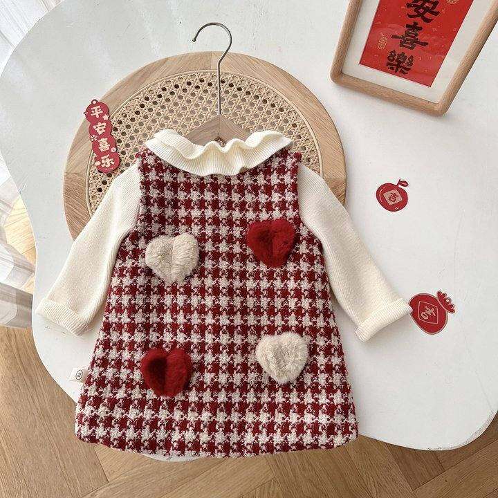 儿童加绒格子背心裙2024冬款洋气童装小女孩爱心加厚裙子女童冬装