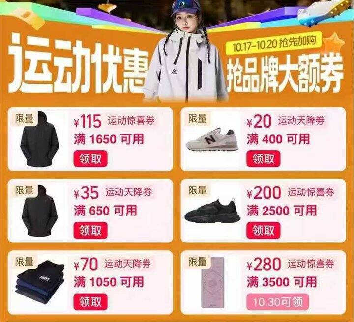 2、部分可用运动品类券1300-110/2000-160https://s.click.taobao.com/e8jitmp