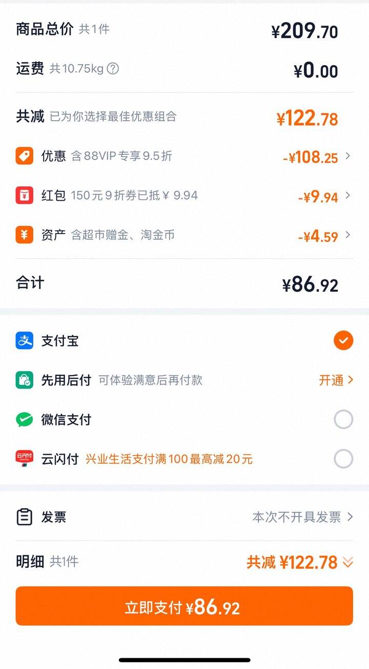 买了这个维达抽纸,30包3件,一共90包,叠加各种优惠券和购物金86.92,算下来0.95/包,也还可以