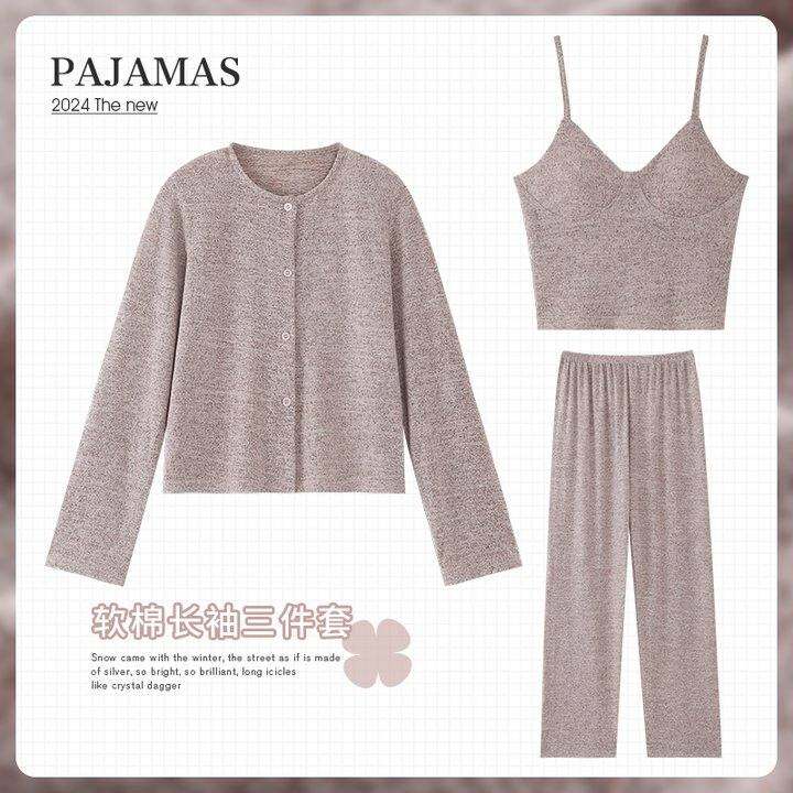 日系时尚三件套睡衣女吊带春秋季长袖纯棉带胸垫莫代尔家居服套装