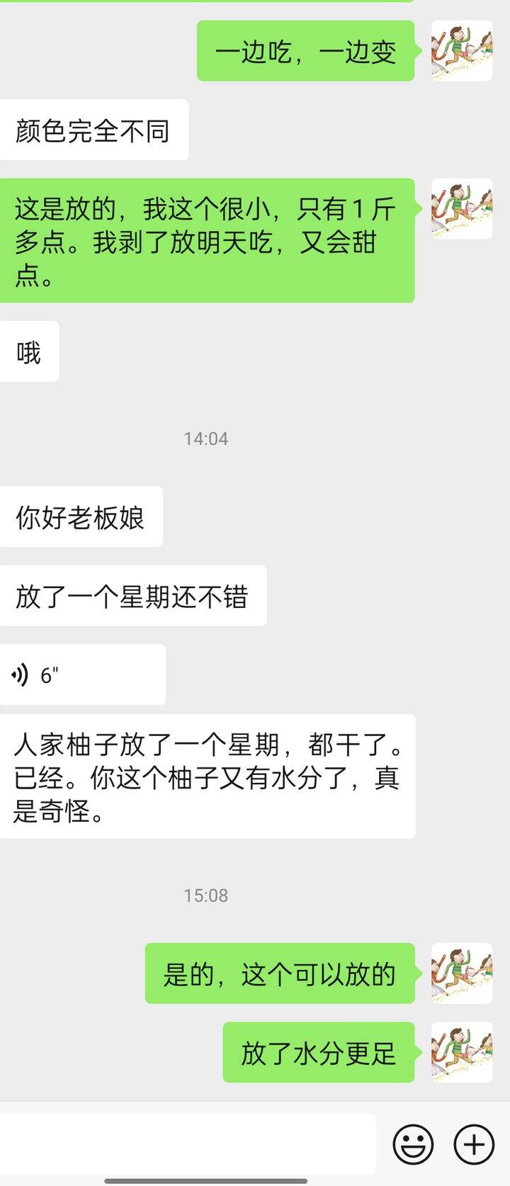 一开始他收到,他觉得有些干,就来问我,因为我自己都吃过,所以就比较了解,今天放了一周,他来反馈了,我在医院康复,那天孩子们在一起打游戏,我就拿了2个出去,他们吃了都说好吃,就问我,我自己的放了20多天,我自己的感觉就是天天吃,吃太多,就会觉得酸,但不是天天吃,是不会觉得酸的,要选2-3斤的其实不好选,之前就出现过,还有柚子,但是我要的大小不够,我宁愿重新摘了再发,或者拿小点的,都不想拿3斤多一个的,那个病友估计都觉得我难搞,但是又不好拒绝我。