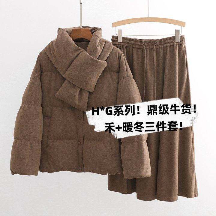禾+暖冬三件套!H*G系列秋冬厚款围脖鹅绒羽绒外套高腰半身裙套装
