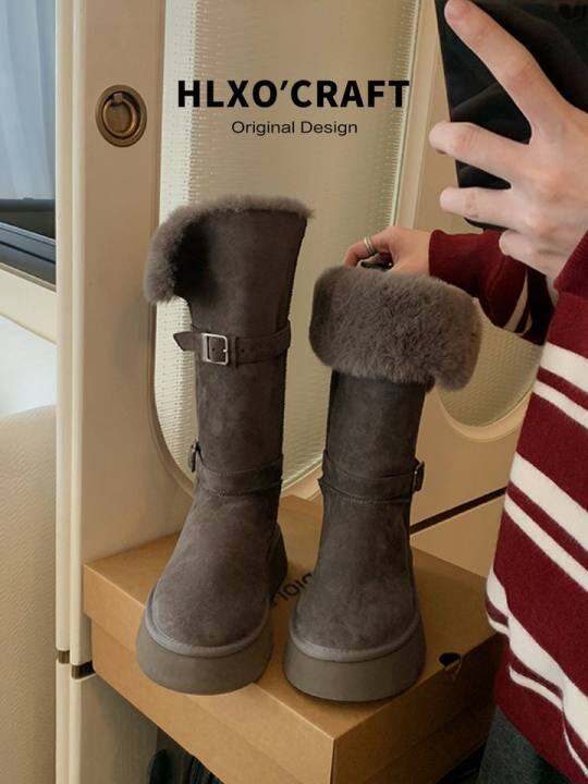 加绒加厚灰色厚底雪地靴女2025冬季新款扣带毛毛翻边雪地棉鞋女