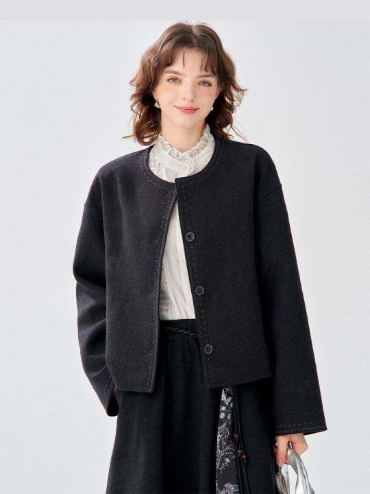 纳纹秋款圆领简约短款毛呢上衣气质显瘦时尚百搭外套女