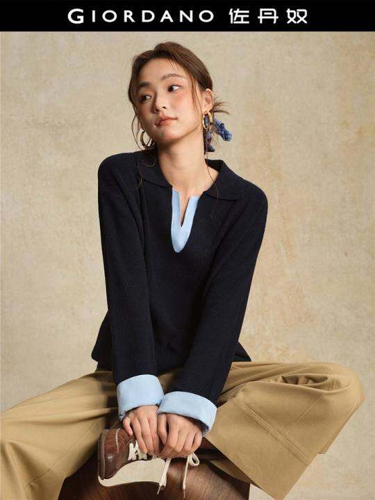 设计师款佐丹奴撞色边针织衫女装假两件拼接V字翻领毛衣18355703
