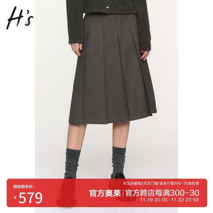 HS奥莱学院风百褶裙2023冬季新款商场同款复古文艺风压褶中长裙子