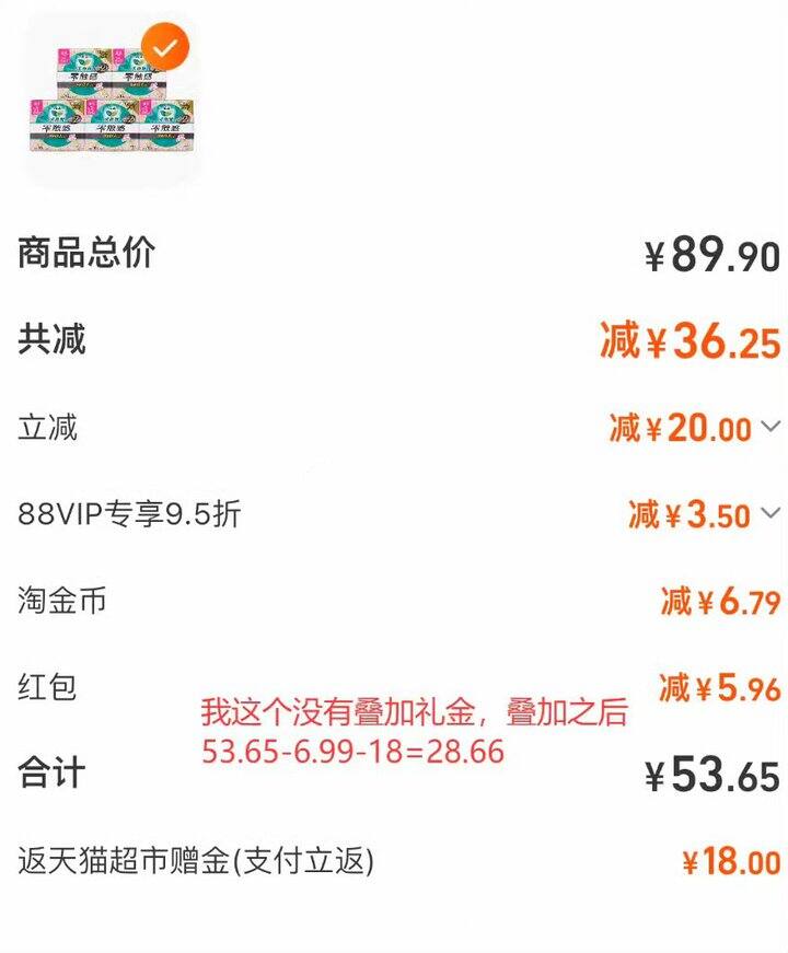 ❸ 返回🛒,88vip拍1件46.66 返18卡=28.66