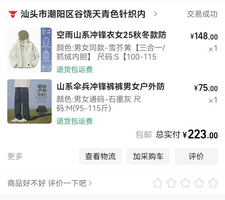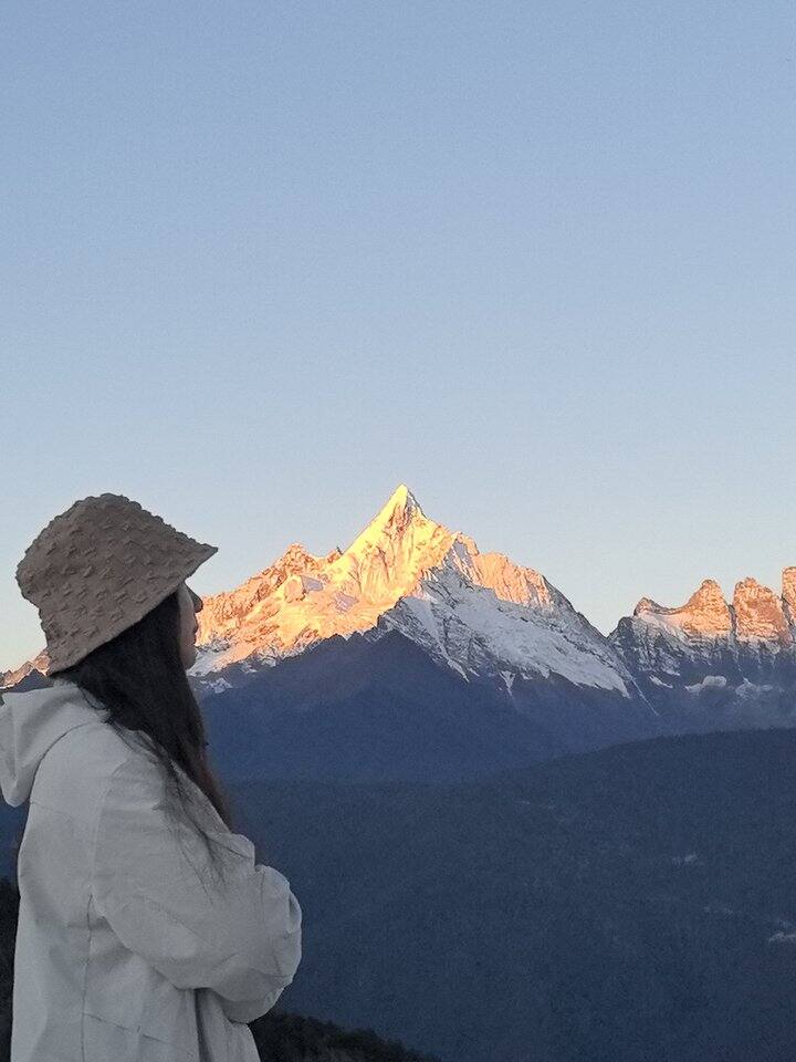 这个冲锋衣有内胆,十月中在梅里雪山厚度是可以的。轻微防水,大雨没试过。这个颜色其实是偏白色,很不耐脏,袖口的脏不知道咋整了。裤子是很薄很薄那种,跟外套不一个季节日照金山: