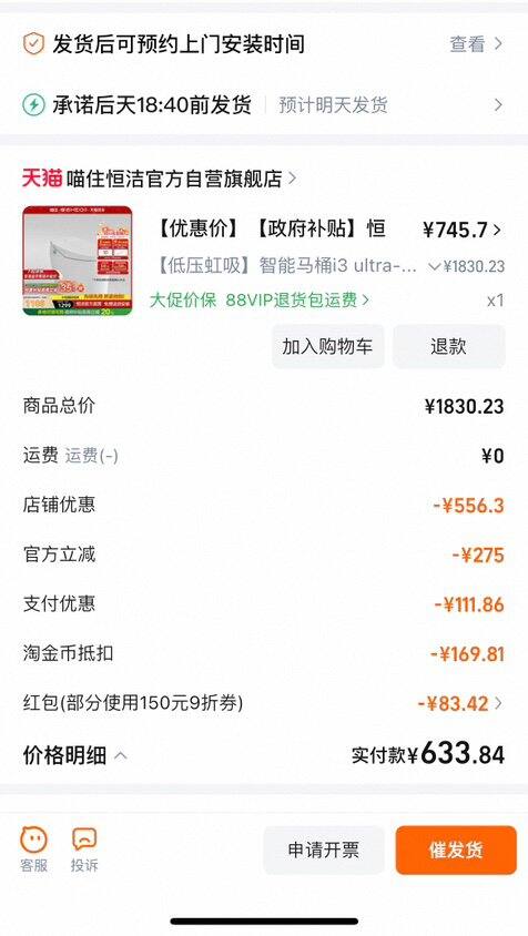恒洁智能即热式虹吸马桶i3 ultra💰555.9