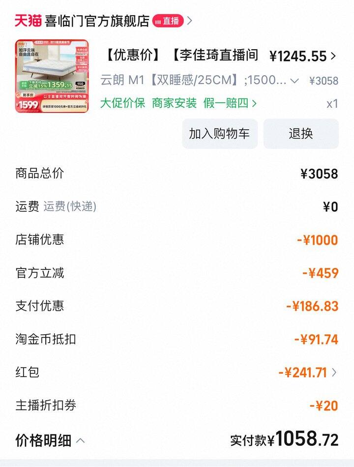 喜临门有弹店铺限时红包再加李佳琦直播间的红包和券,这款是双面睡感的