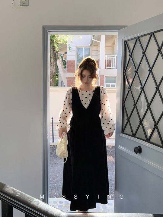 应小姐大码女装[Gracie]丝绒连衣裙套装,新秋季圆点衬衫两件套