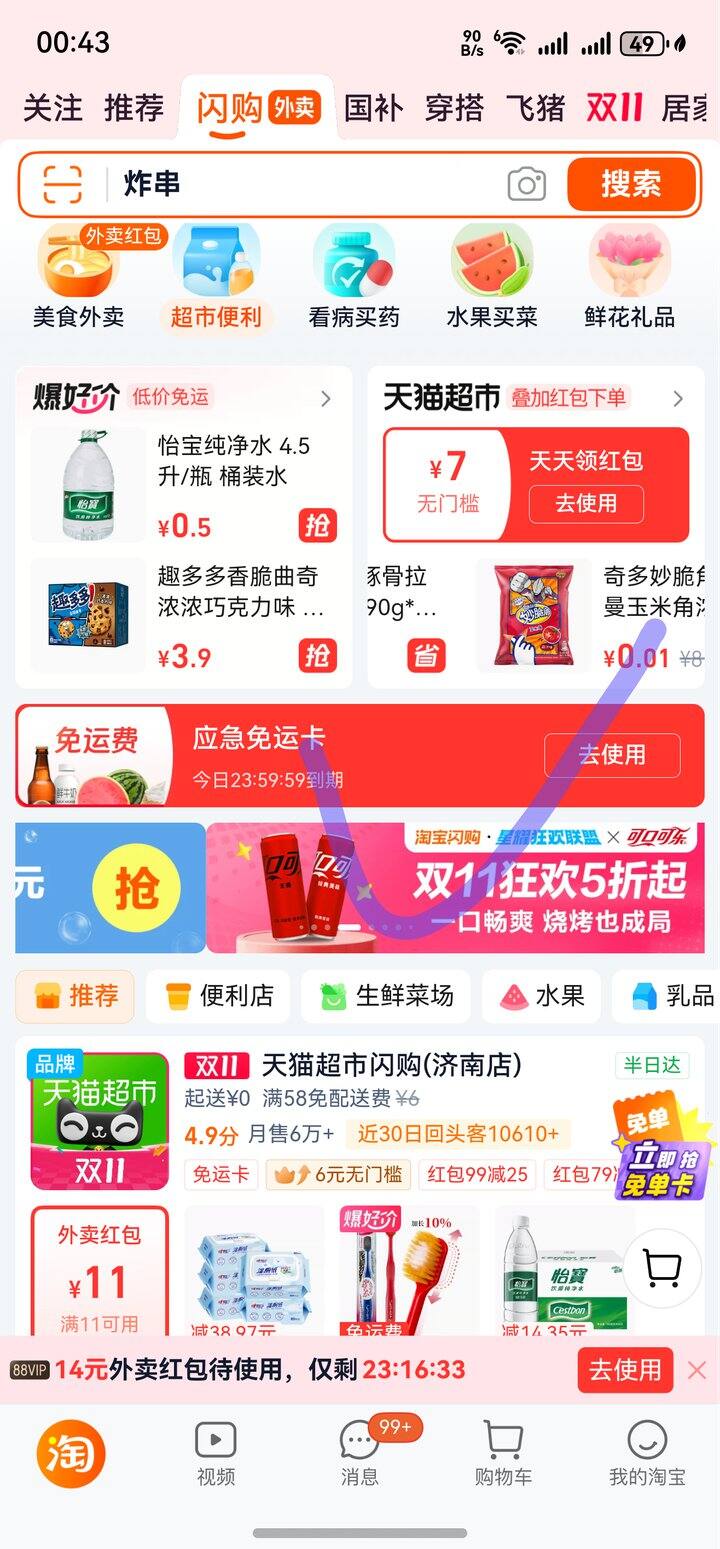 1️⃣淘宝首页-闪购-超市便利,领免运卡