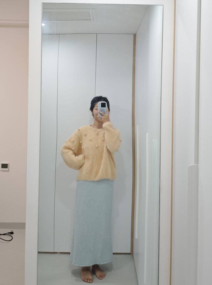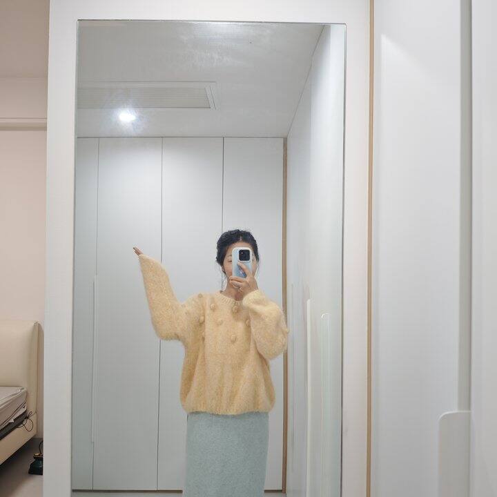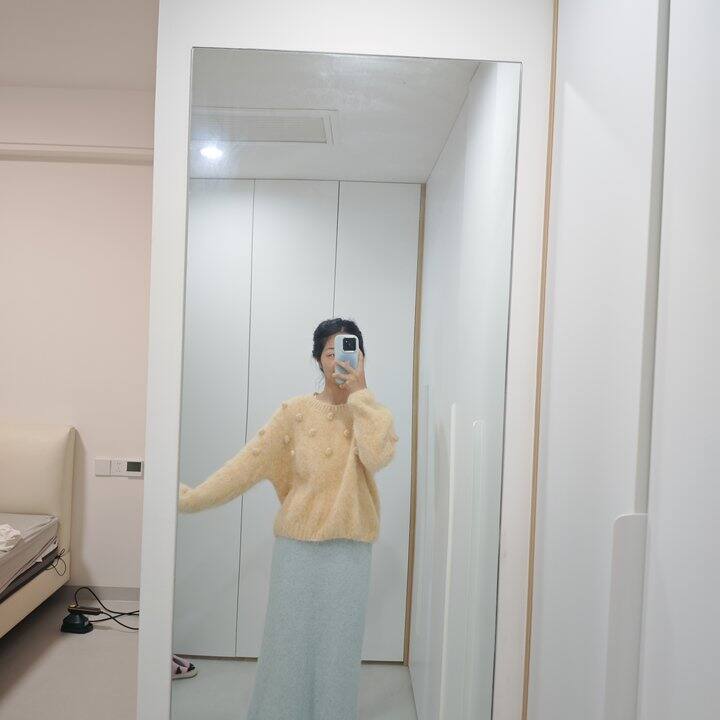 出乎意料,实物跟主图一致,所见即所得,好好看,有冬天的氛围感。上衣毛绒绒的,又超级可爱,略微扎,穿个秋衣会更舒服。裙子是直筒的,版型特别好,不显胯,我买的蓝色,颜色很温柔。