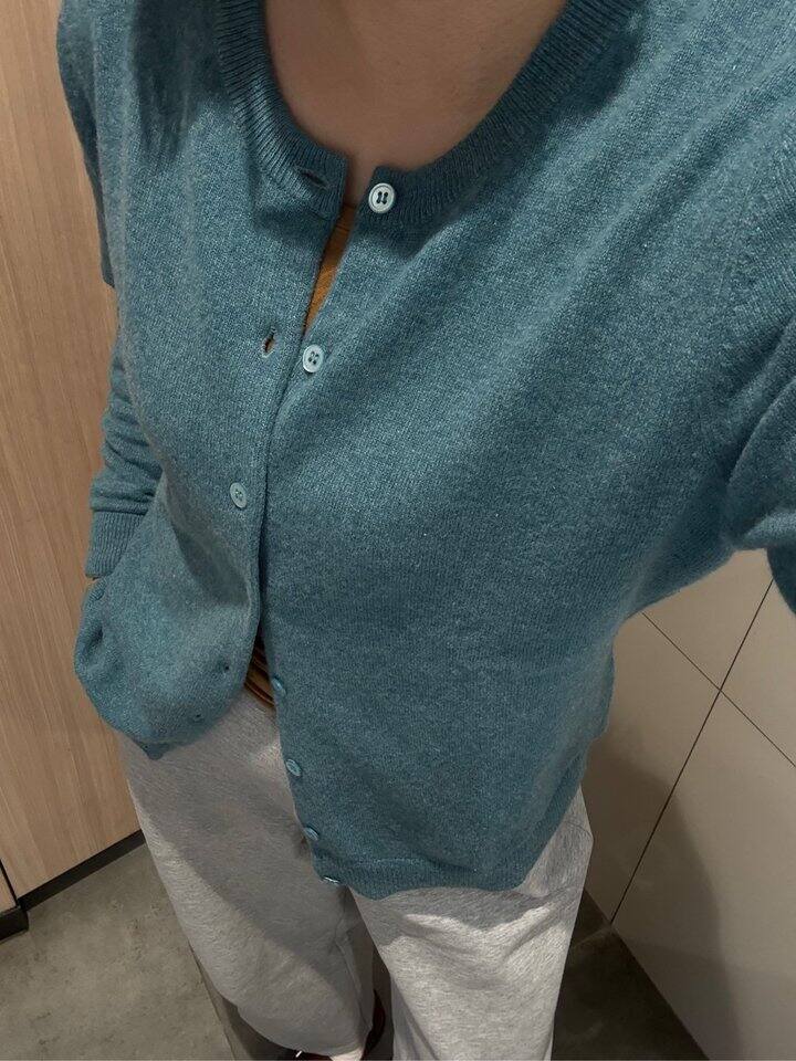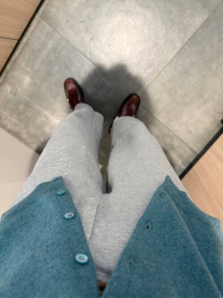 蓝绿色针织衫配米色裤子,搭配皮鞋