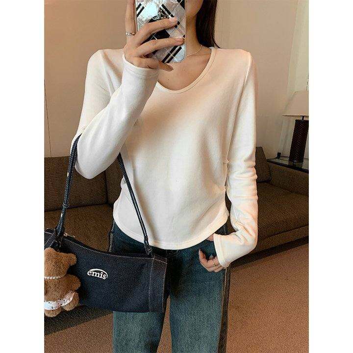 白色正肩V领长袖t恤女2025年春季褶皱收腰加绒加厚打底衫内搭上衣