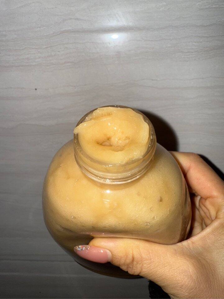 特意找了一瓶我之前放冰箱结晶的蜂蜜,看下咱们家的蜂蜜结晶体绵密的很,特别细腻,有个博主一年买很多蜂蜜她说她的判断标准就是买农家土蜂蜜,买结晶细腻的证明成熟蜜,水分少,不容易坏,