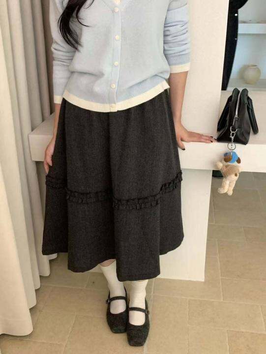 lilian~简约拼接木耳边毛呢秋冬韩系松紧腰百搭半身裙女458835