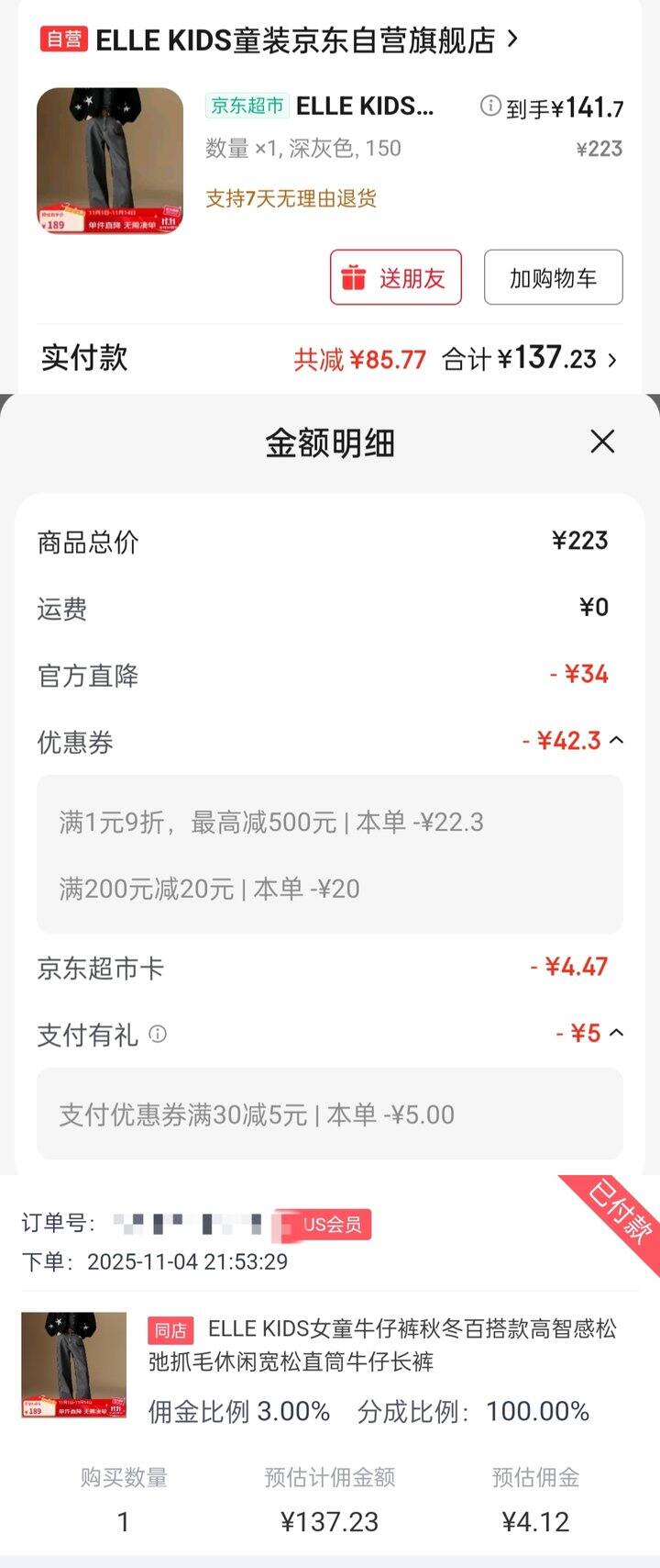 深灰色牛仔裤——137.23元+超市卡本金2.59元-返利4.12元=135.7元(下单抽中0.66元超市卡)