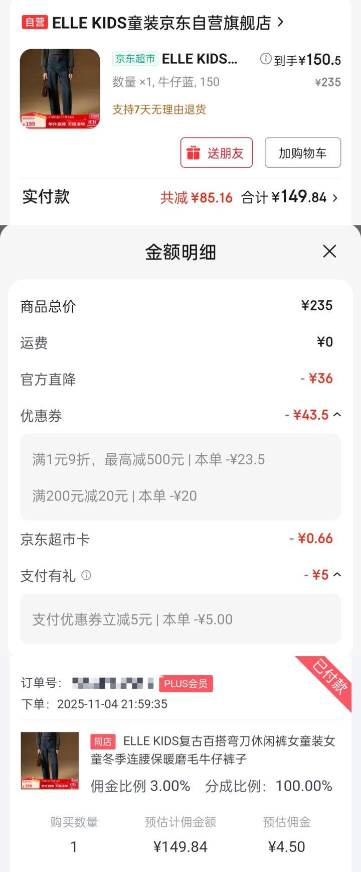 蓝色牛仔裤——149.84元-返利4.5元=145.34元