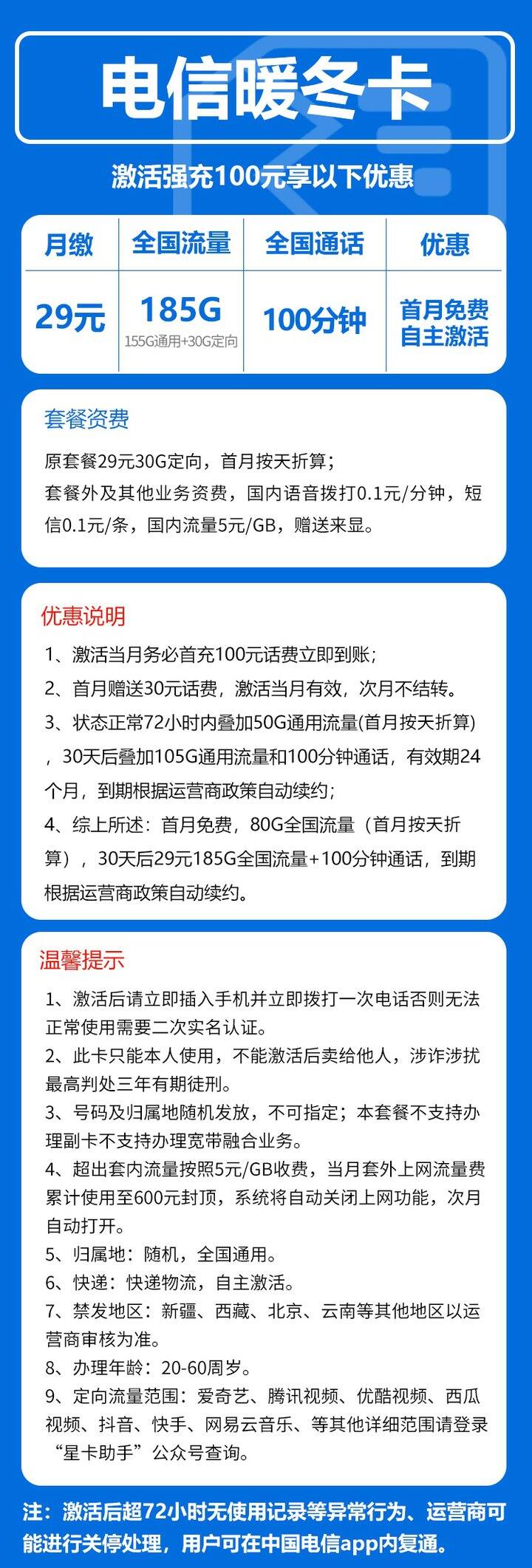 电信卡29元185g 100分钟免费通话,办理成功路口姐妹次月底微信再返50元(全国发货)