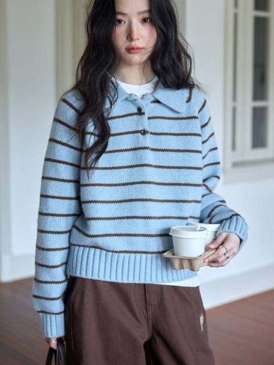 1313撞色miu系温柔polo领蓝棕条纹2025女冬宽松套头针织保暖毛衣