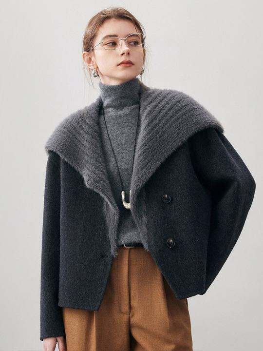 科蒙博卡2025秋冬新款拼接大翻领羊毛大衣女纯色短款宽松毛呢外套
