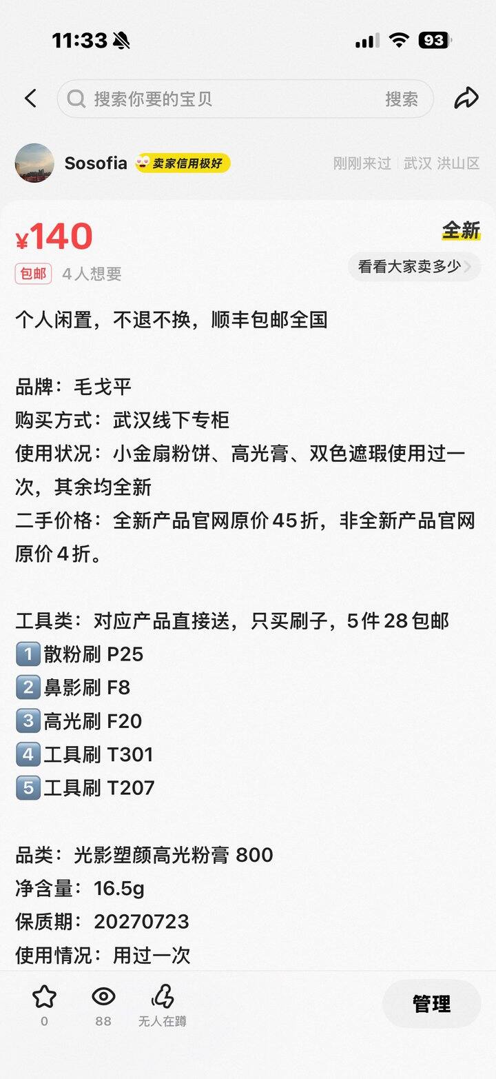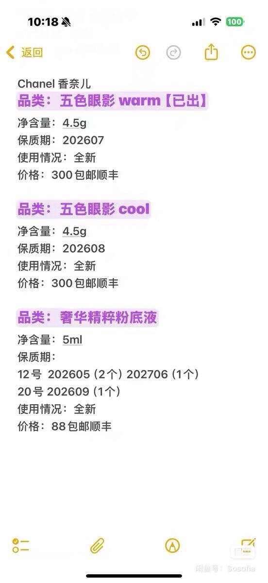 走平台,基本上都是闲置在家里全新未使用的产品。价格如图所示,有感兴趣的可以联系我。有 Chanel 香奈儿的眼影和粉底液小样,有 tf 的眼影,有毛戈平的很多东西。基本上全线都有。