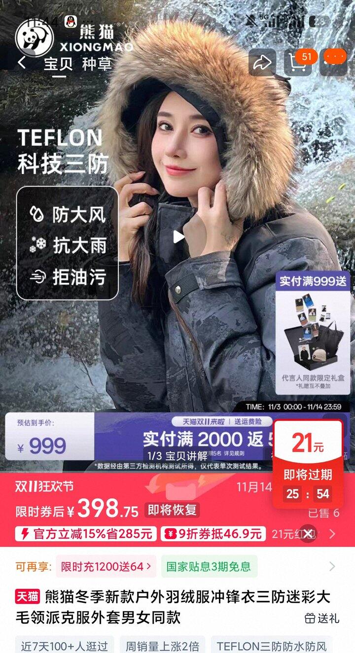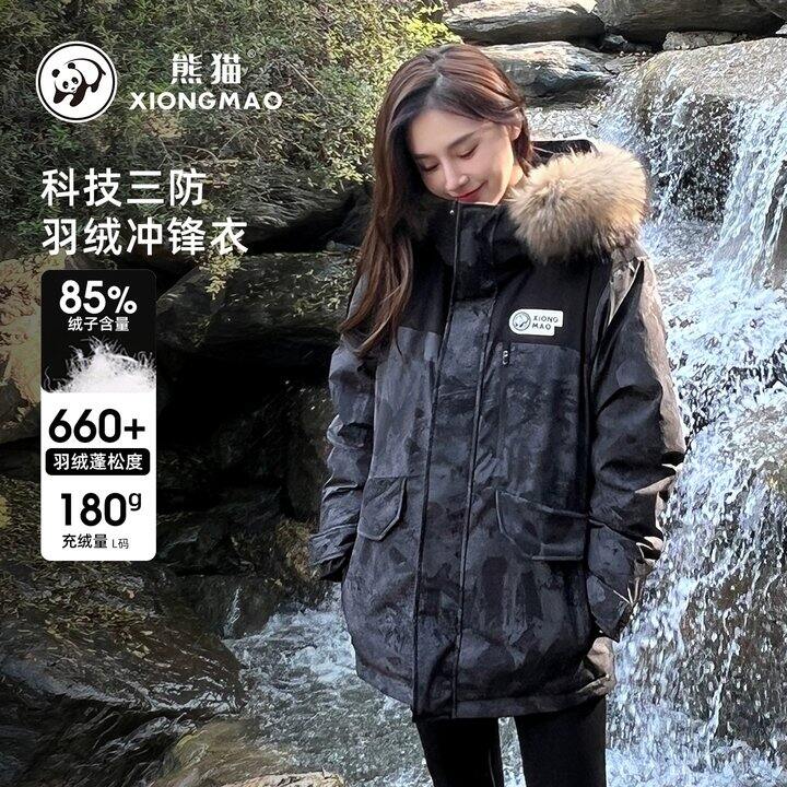 1、熊猫冬季新款户外羽绒服冲锋衣三防迷彩大毛领派克服外套男女同款https://m.tb.cn/h.SpyZMKa弹89礼金