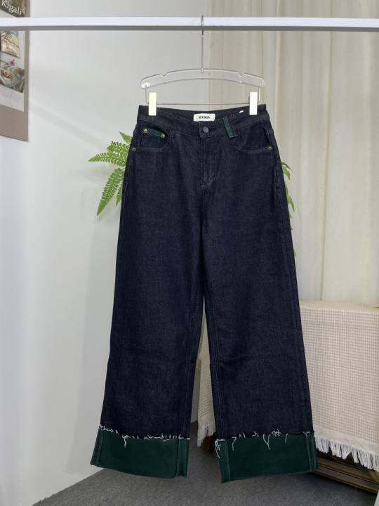 深蓝色拼接圣诞绿植绒牛仔裤 69009