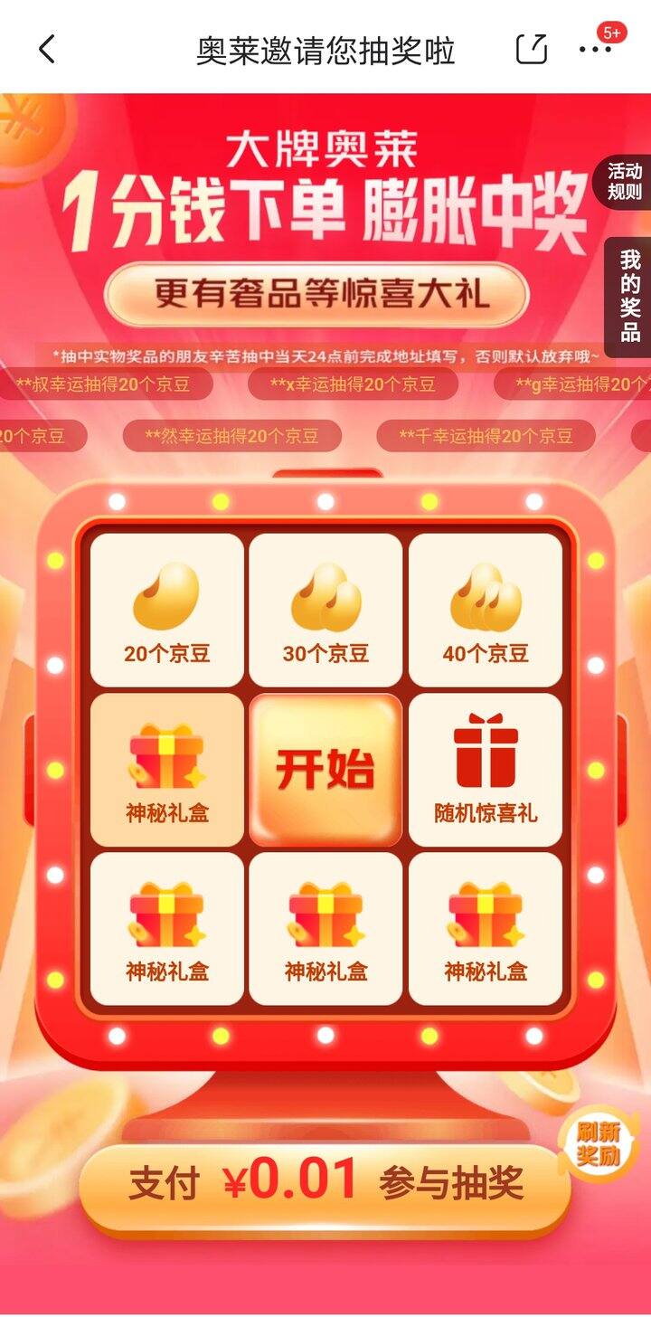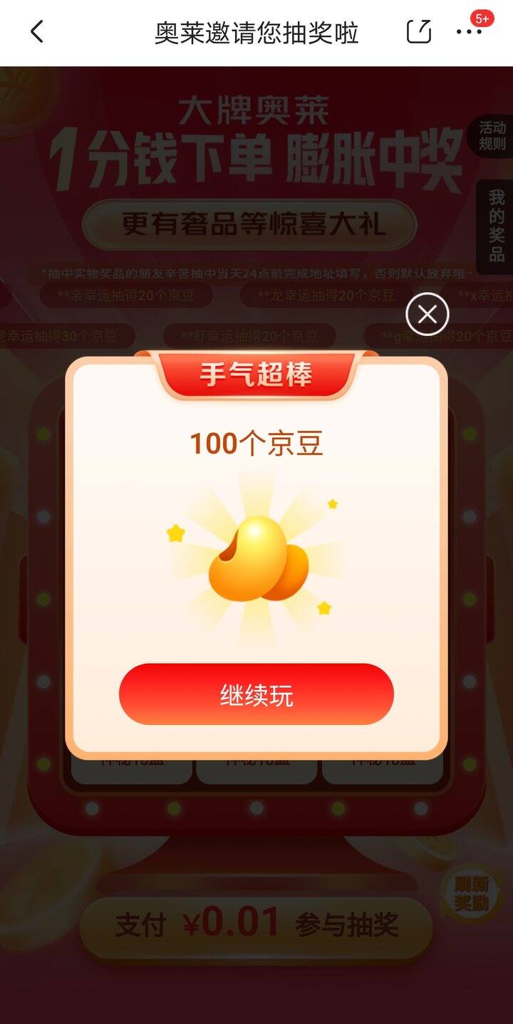 而且一分钱付款后,还能抽到5京豆。