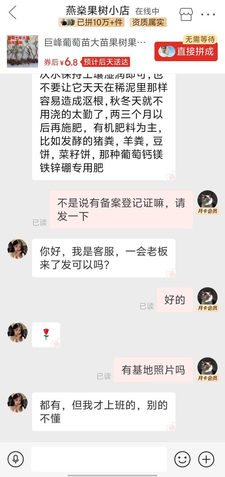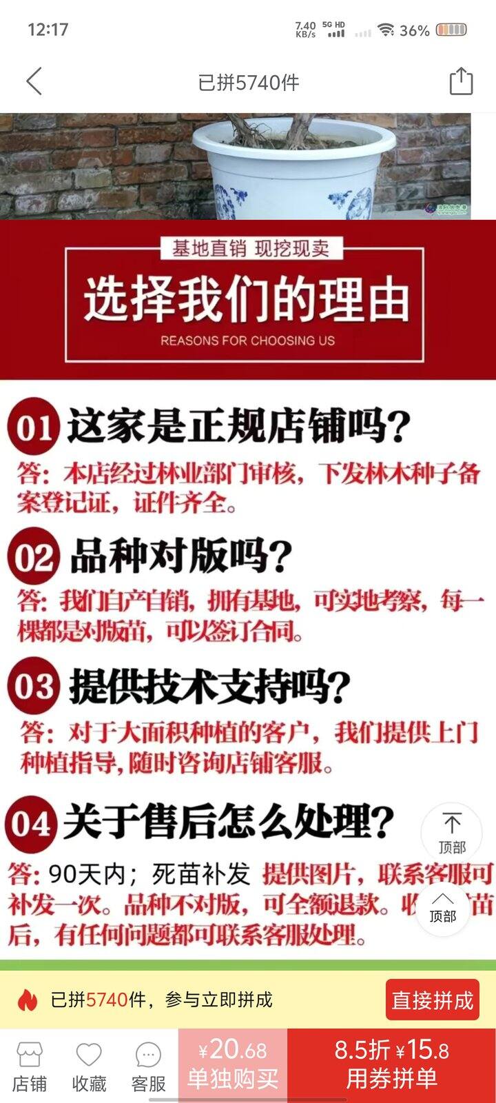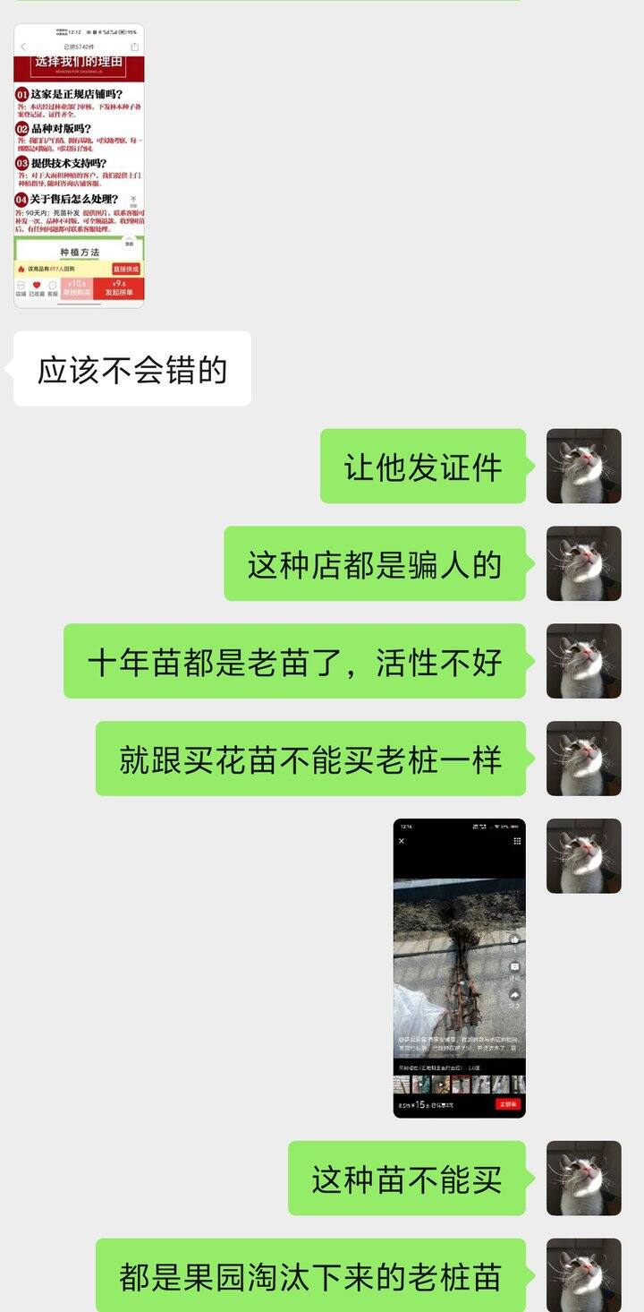 我爸中午告诉我他拼多多买了一棵十年的葡萄树苗,18块钱。我一看头都大了,赶紧告诉他这种不能买。他甩我一张店铺详情页截图↓