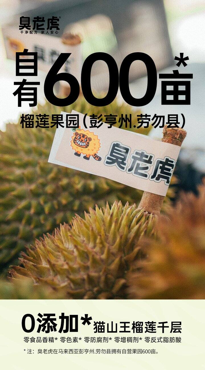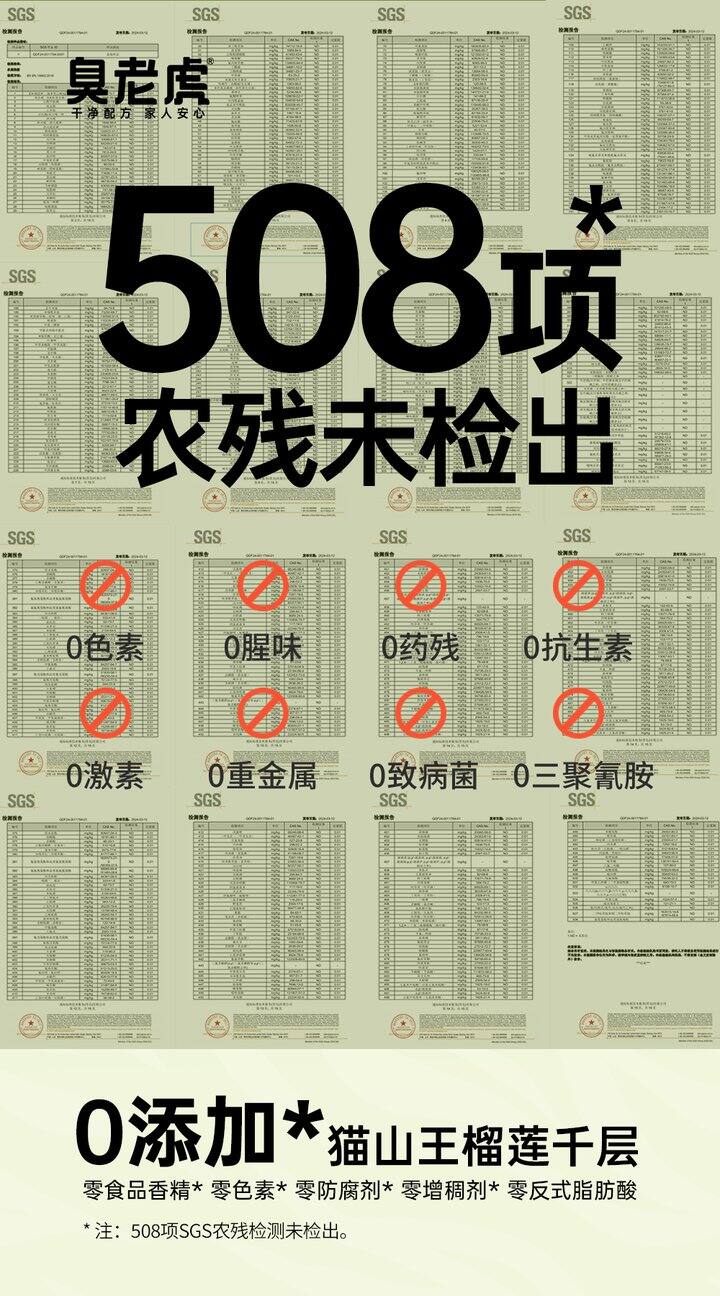 ✅好吃要"安全检测、家人安心"臭老虎0添加「猫山王」榴莲千层做508项SGS农残检测✔权威508项SGS检测0检出✔也没有香精、色素、防腐剂等添加剂✔没有反式脂肪酸,甜味来源于猫山王本身享受美味和健康的同时吃起来也没负担