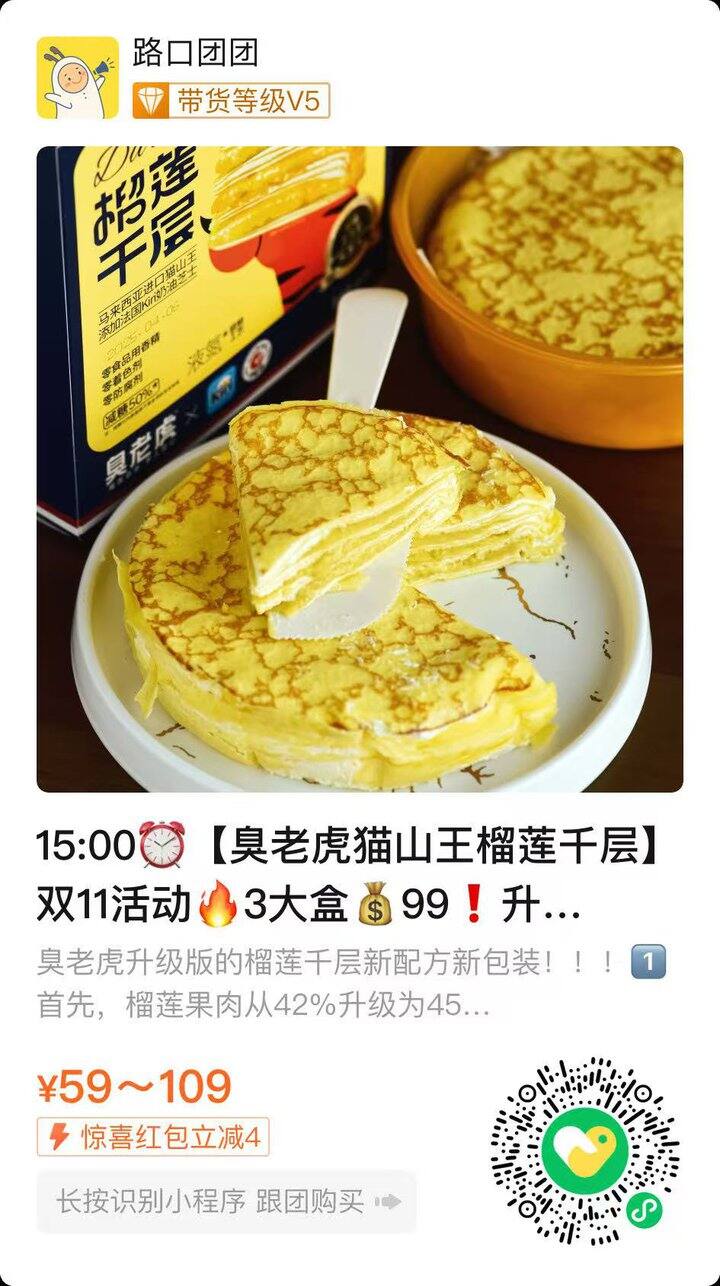 秒杀价!【3盒】臭老虎0添加猫山王榴莲千层 99元,领取惊喜红包,最终到手95元
