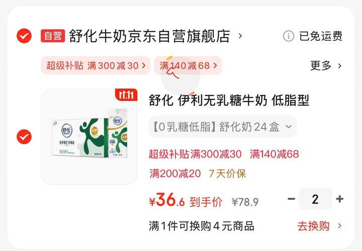 ❶ 舒化 伊利无乳糖牛奶 低脂型220ml*24盒