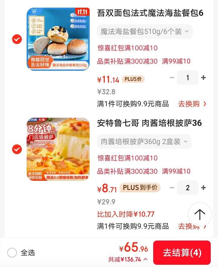 今天披萨比30号又便宜了一点,肉酱披萨4块钱左右一个,榴莲披萨一个五块多。凑单买的餐包我买过好几次,好吃~
