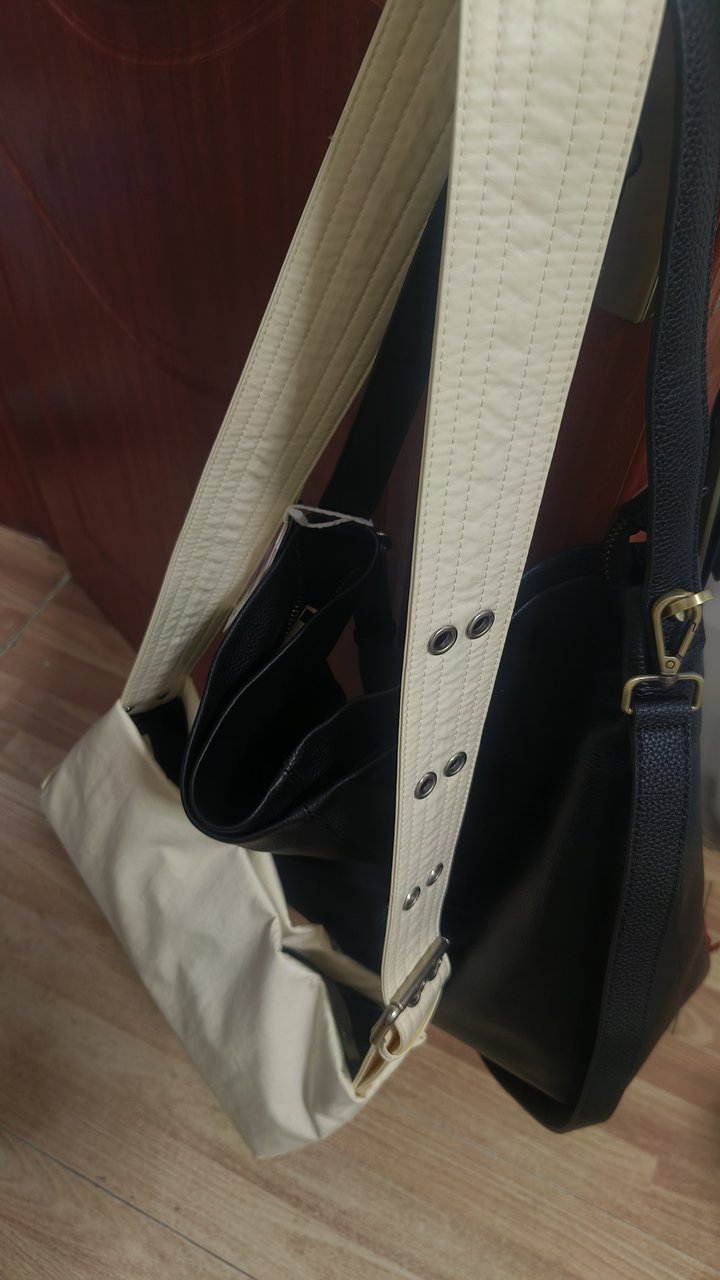 再换一个大的黑色包包天天乱七八糟往帆布袋里放,平时上班还好,外出不想背双肩包的时候,帆布袋只能侧背不能斜挎,一个是不好搭配衣服一个是背着不方便。