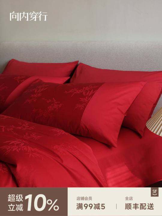 向内穿行A类长绒棉红色竹子提花结婚床上四件套婚庆喜被囍嫁床品