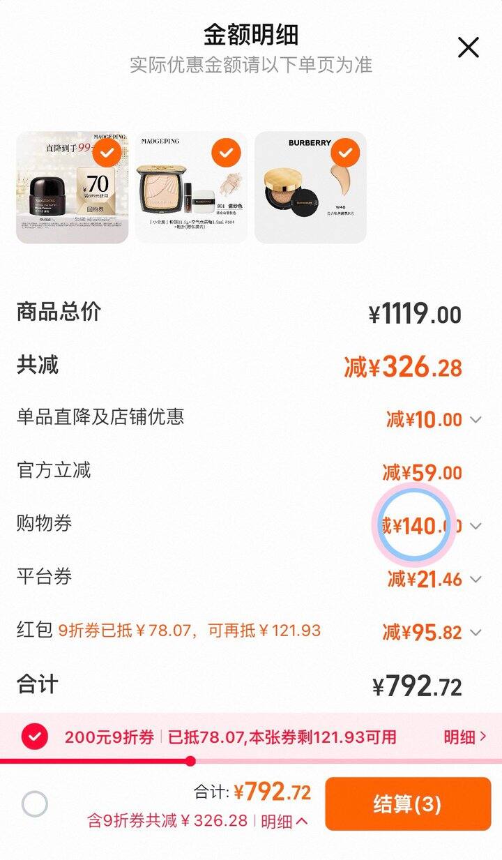 1000-140美妆券凑单拍一后退