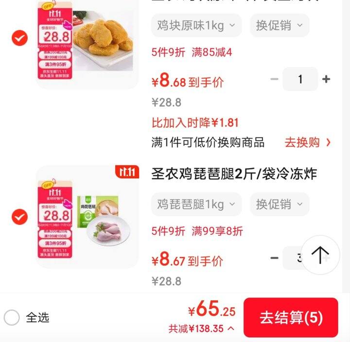 鸡腿、鸡翅根、鸡块、鸡米花有5件9折。买下来才4块多一斤!超级好价!