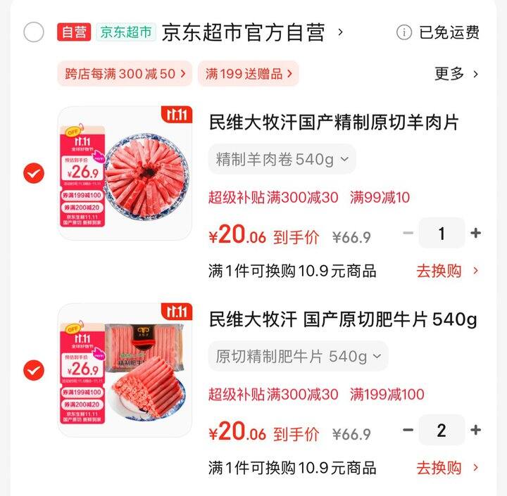 民维大牧汗国产精制原切羊肉片540g/国产原切肥牛片540g,组合买3件